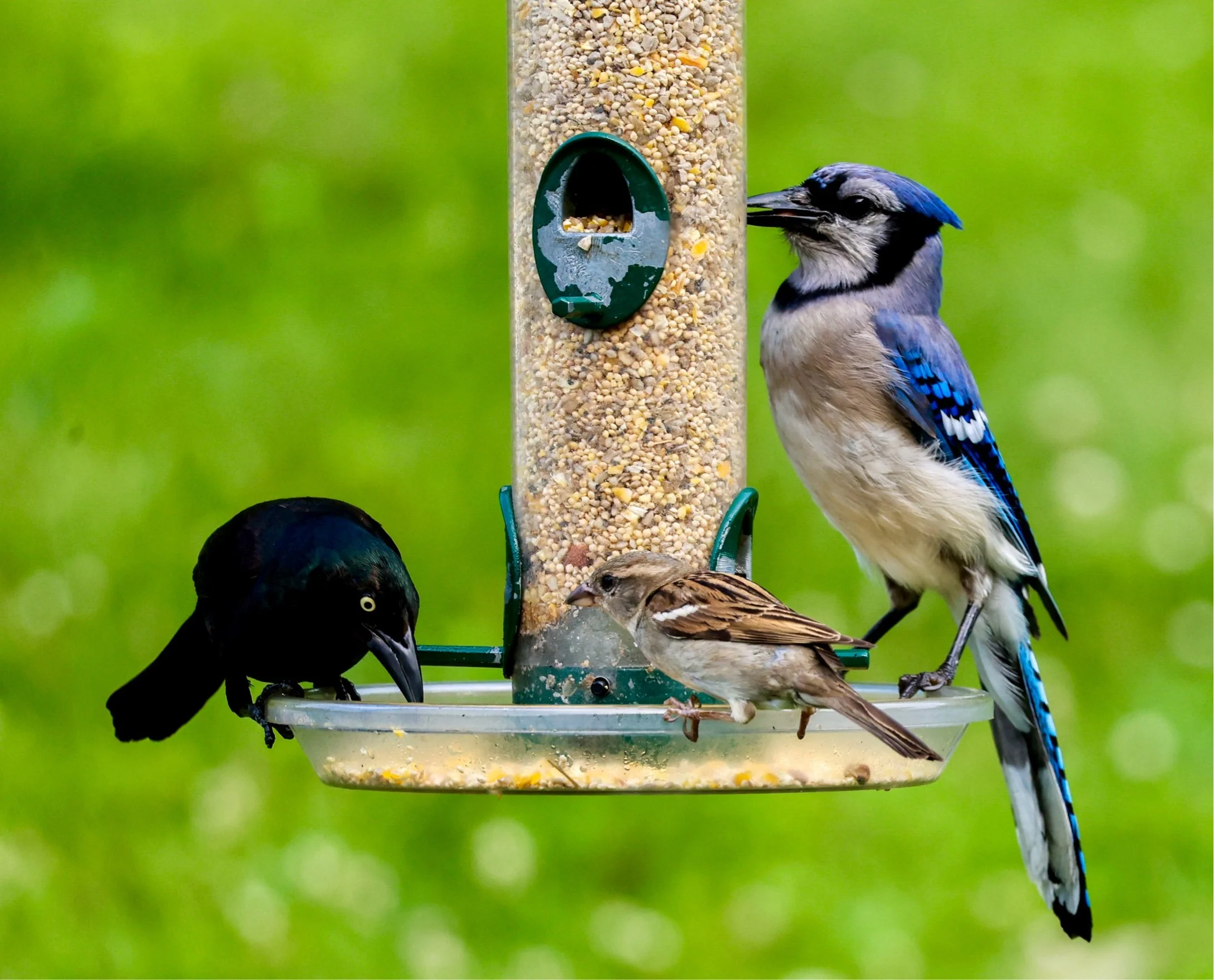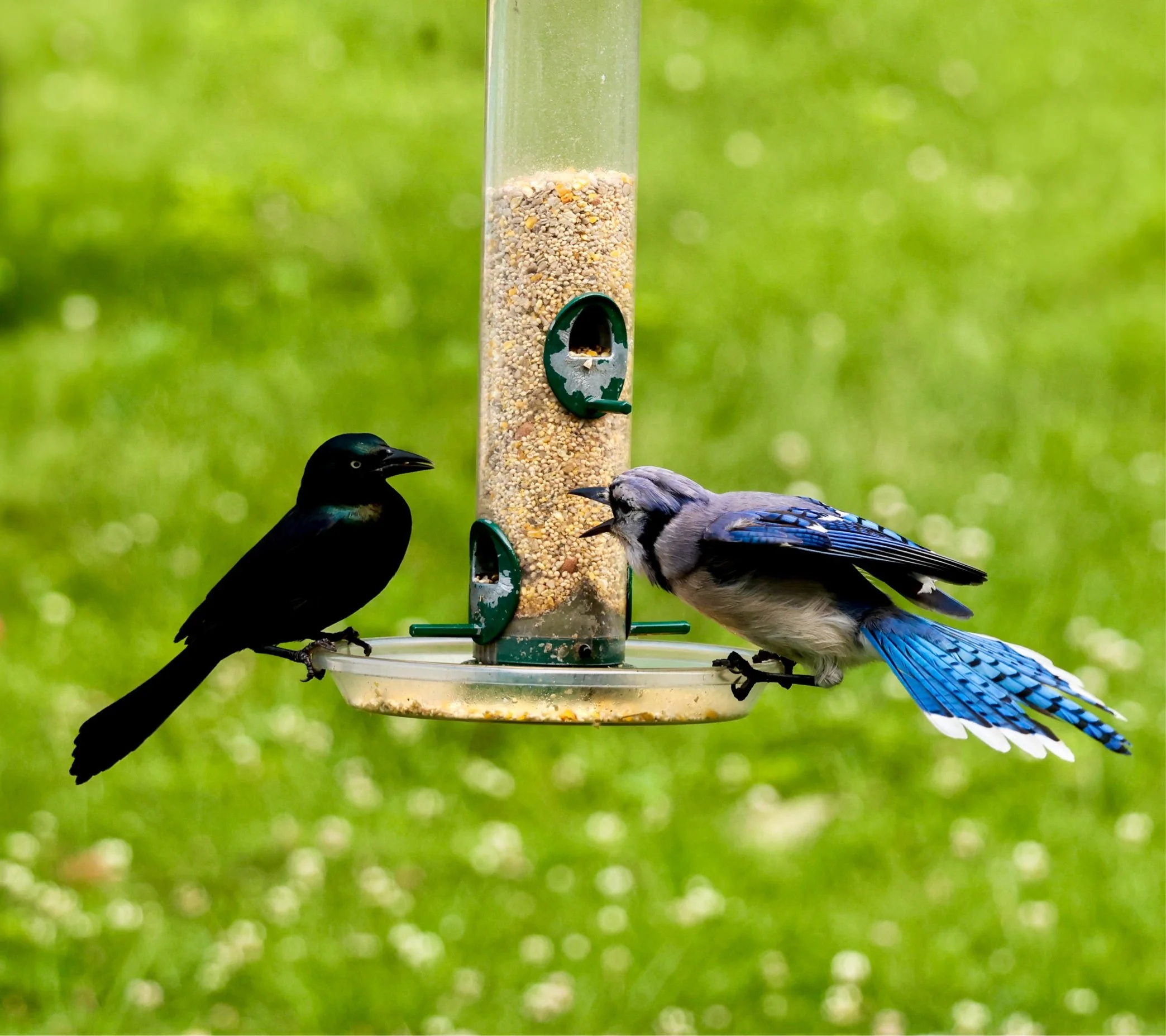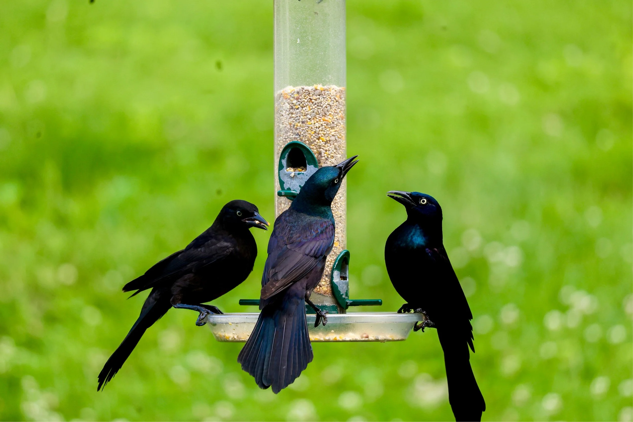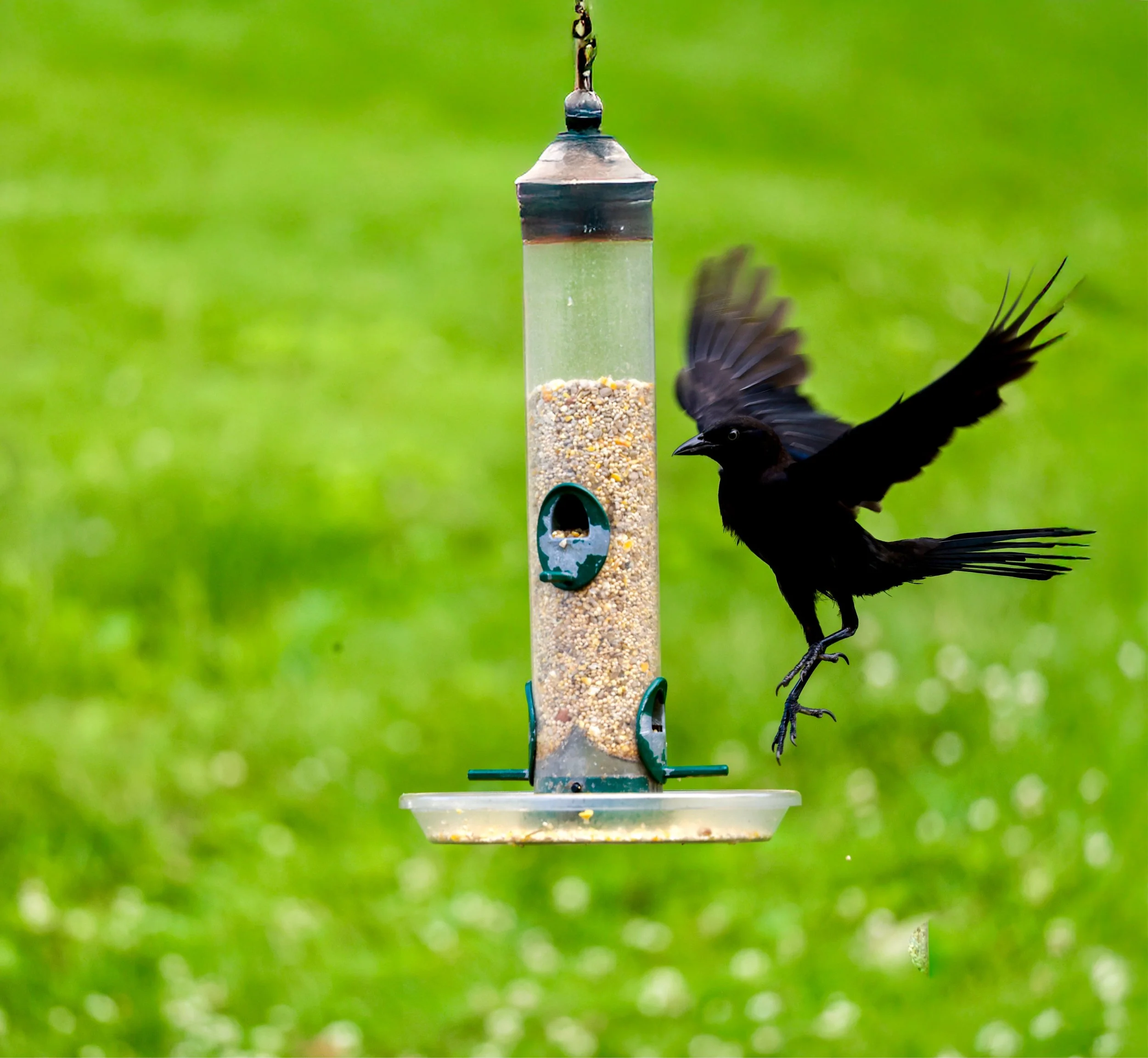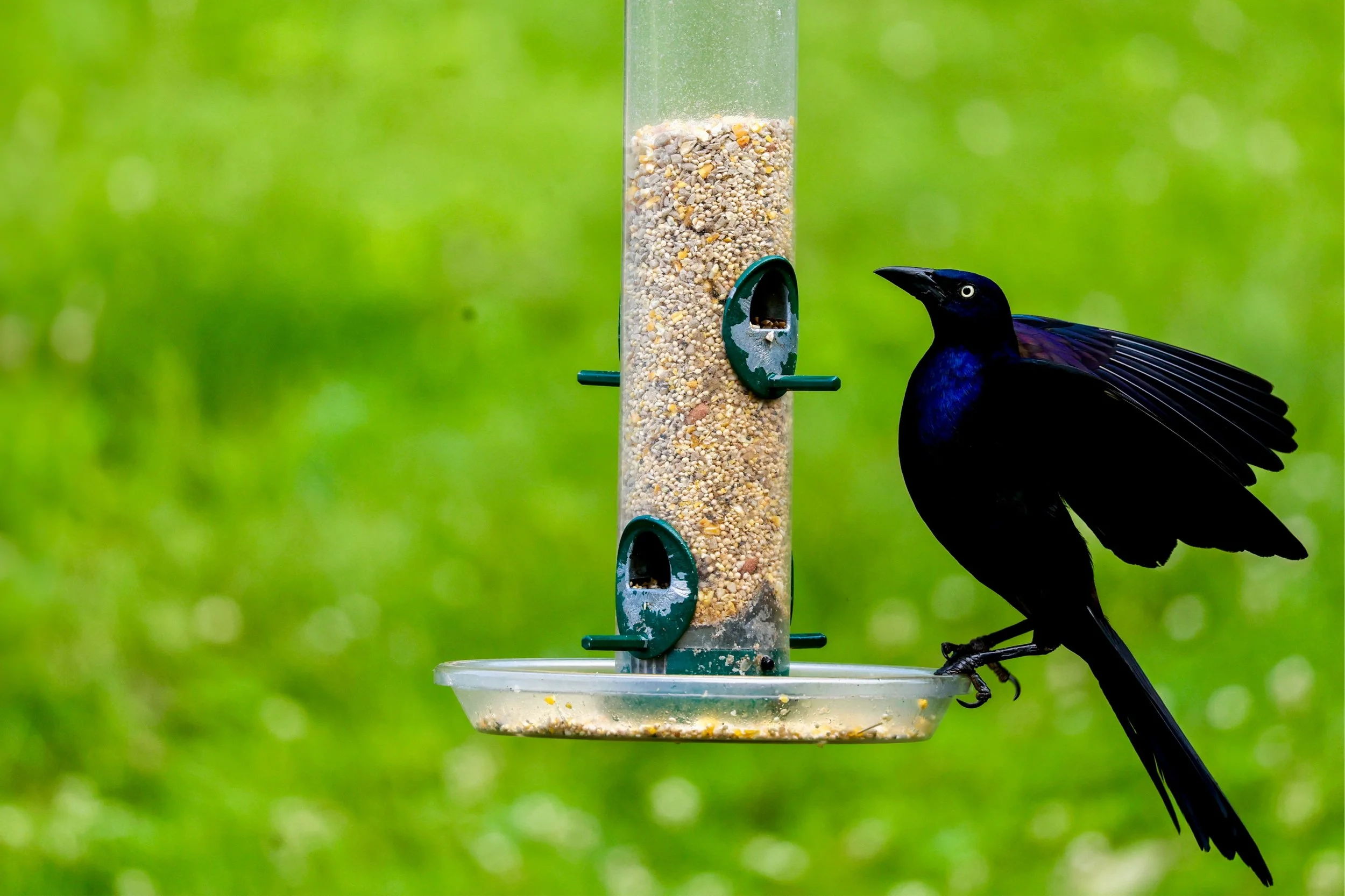 Squirrels will keep the birds away. Try spraying the metal pole with Pam (or any cooking spray). The furry little bandits will keep sliding down, at least for awhile.