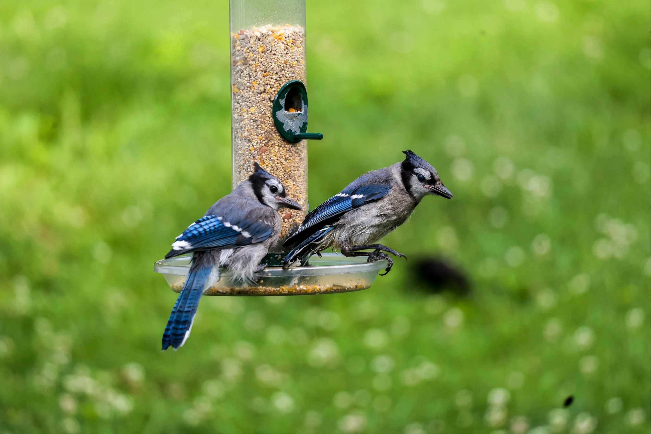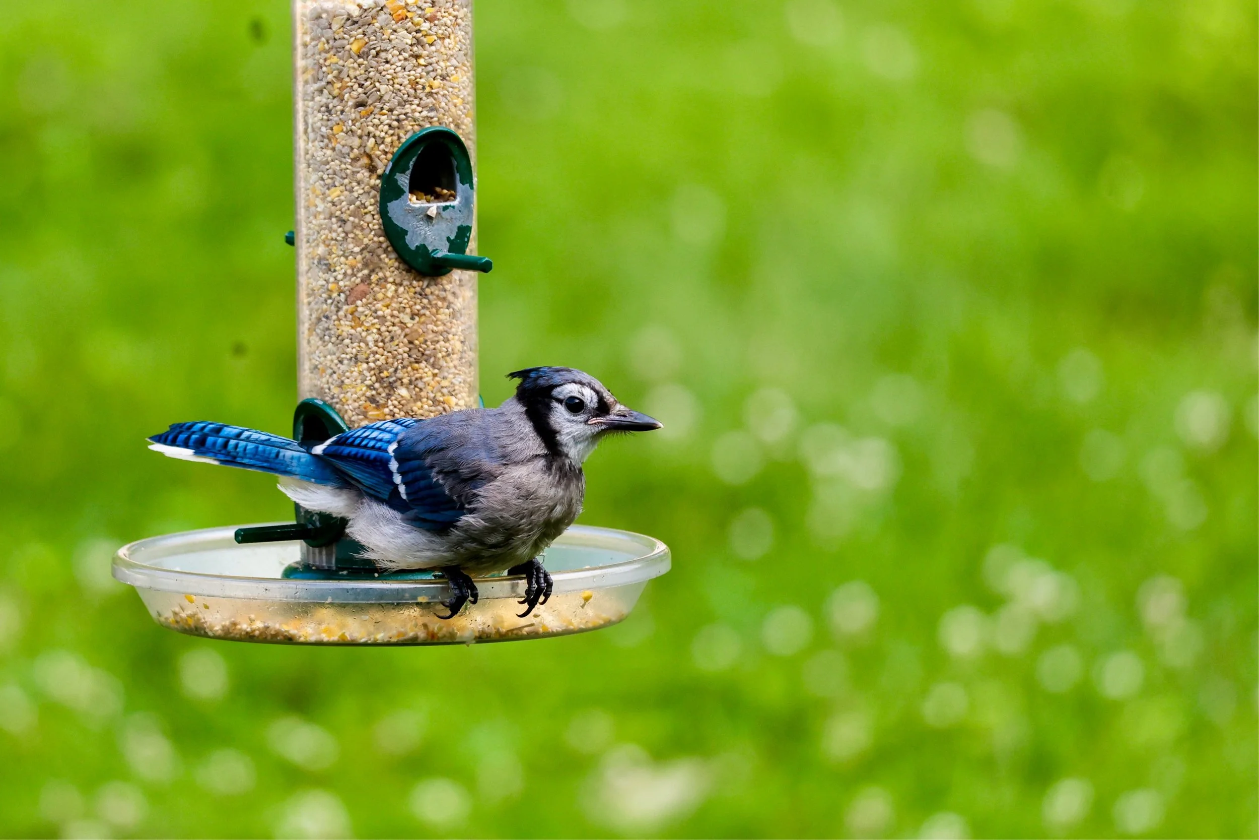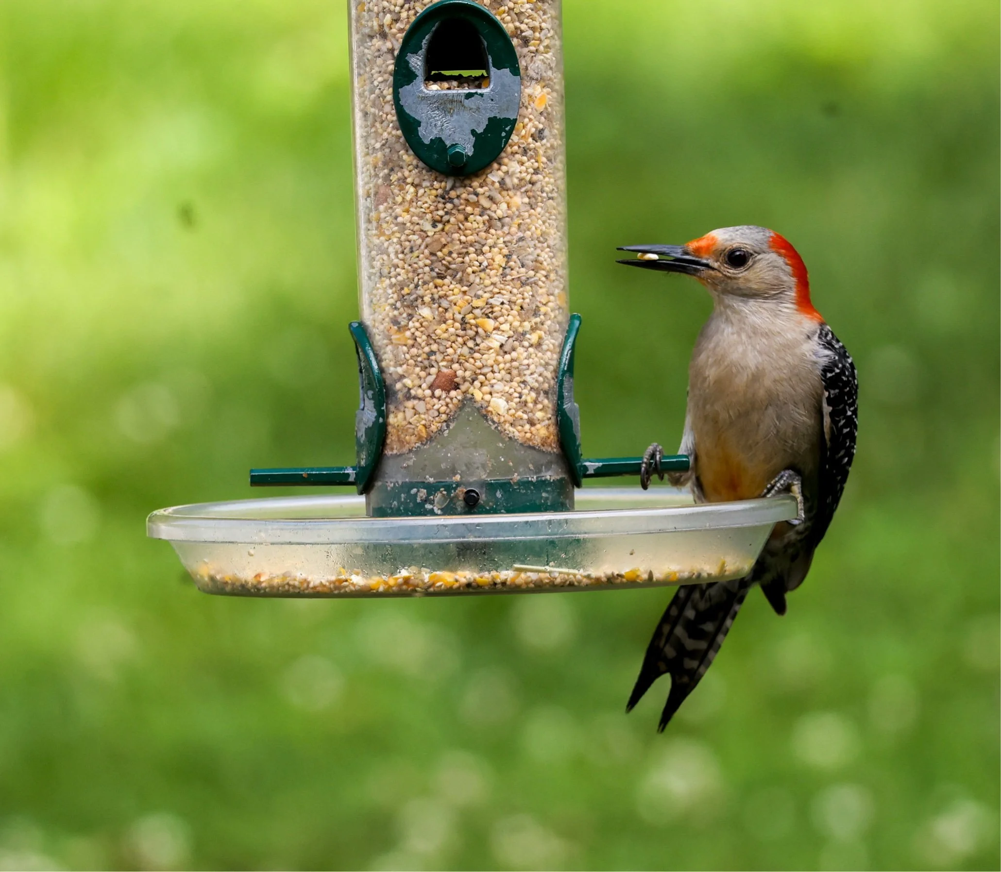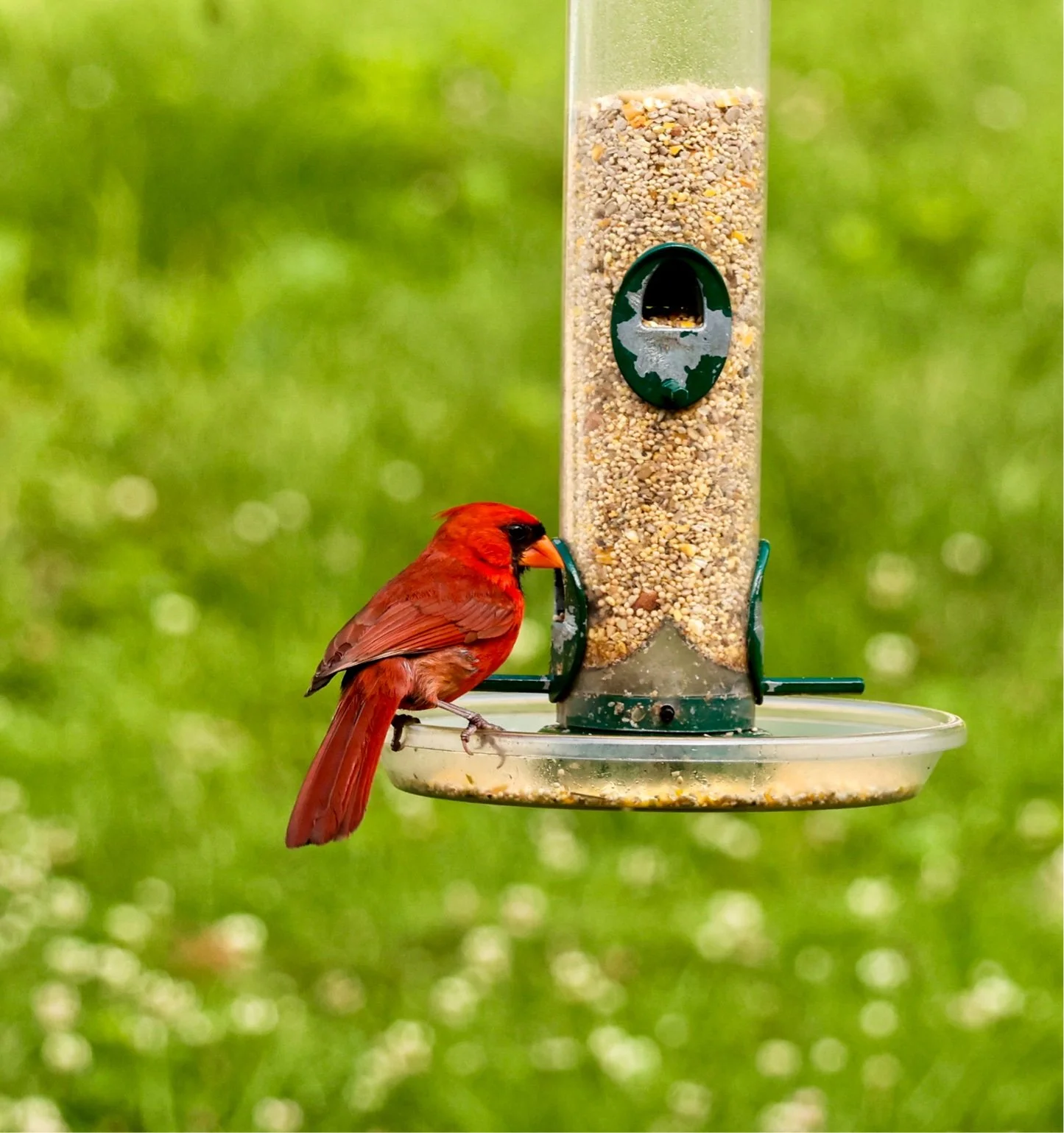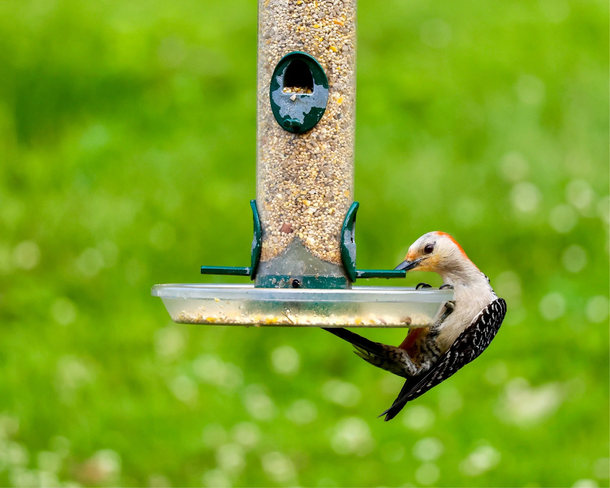 Squirrels will keep the birds away. Try spraying the metal pole with Pam (or any cooking spray). The furry little bandits will keep sliding down, at least for awhile.